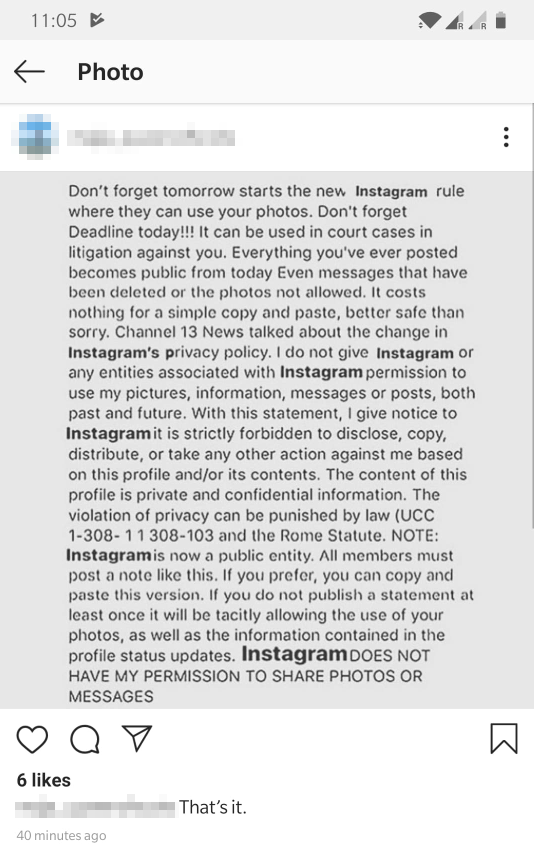 Na Instagramu se prethodnih dana dele objave u kojima korisnici toj kompaniji i povezanim organizacijama „ne dozvoljavaju“ korišćenje njihovih fotografija, podataka, poruka ili objava. Navodno, davanjem takve izjave Instagramu je zabranjeno da distribuira i kopira sadržaje ili preduzima bilo kakve postupke protiv korisnika na osnovu sadržaja profila, pozivajući se na „Rimski statut“. Istom objavom se korisnici podstiču da je podele kako bi to uradili pre promene politike privatnosti Instagrama. Želimo da pojasnimo da ne počinju da se primenjuju nikakva nova pravila koja zahtevaju izjave povlačenja pristanka, kao i da su sva pitanja u vezi sa profilima korisnika i obradom podataka uređena Uslovima korišćenja Instagrama i Politikom podataka o ličnosti, što korisnici moraju da prihvate ukoliko žele da kreiraju profil i koriste tu društvenu mrežu. Objavljivanje ovakvih i sličnih tekstova na platformama društvenih mreža nema nikakvu pravnu snagu i ne predstavlja način da se kompanijama poput Instagrama ili Fejsbuka onemogući obrada fotografija i drugih podataka o ličnosti prikupljenih od korisnika, a da se nastavi sa korišćenjem profila.