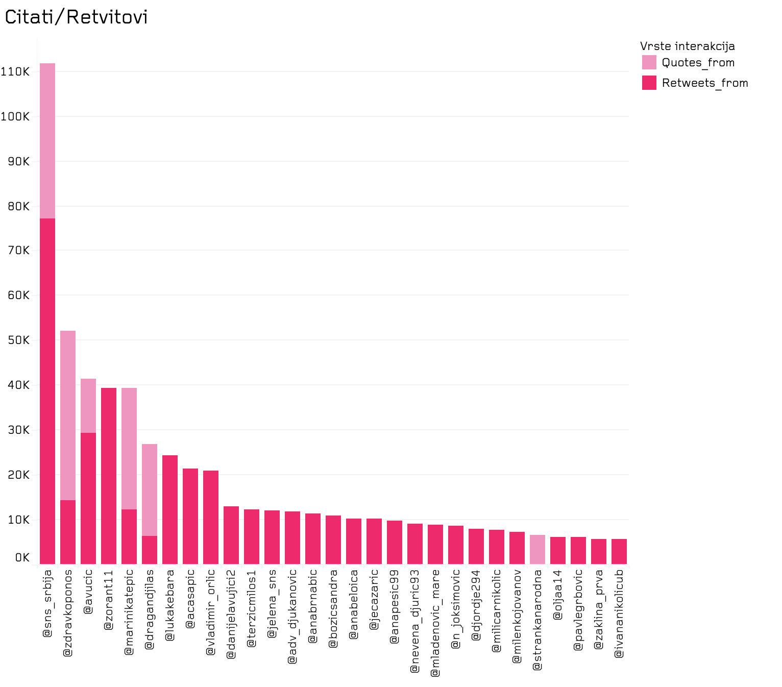 Tviter: koliko puta su nalozi retvitovani i citirani (quote tweet)
